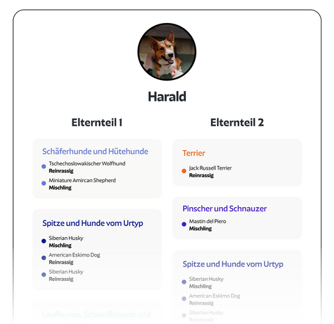 Mit unserem DNA-Test zur Rassebestimmung entdeckst du die genetische Zusammensetzung deines Lieblings aus über 350 Rassen – auf den Prozent genau. Folge dem Stammbaum über mehrere Generationen und gewinne tiefe Einblicke, um deinen Begleiter besser zu verstehen und individuelle Bedürfnisse, wie Aktivitäten, Ernährung und Fürsorge zu berücksichtigen.